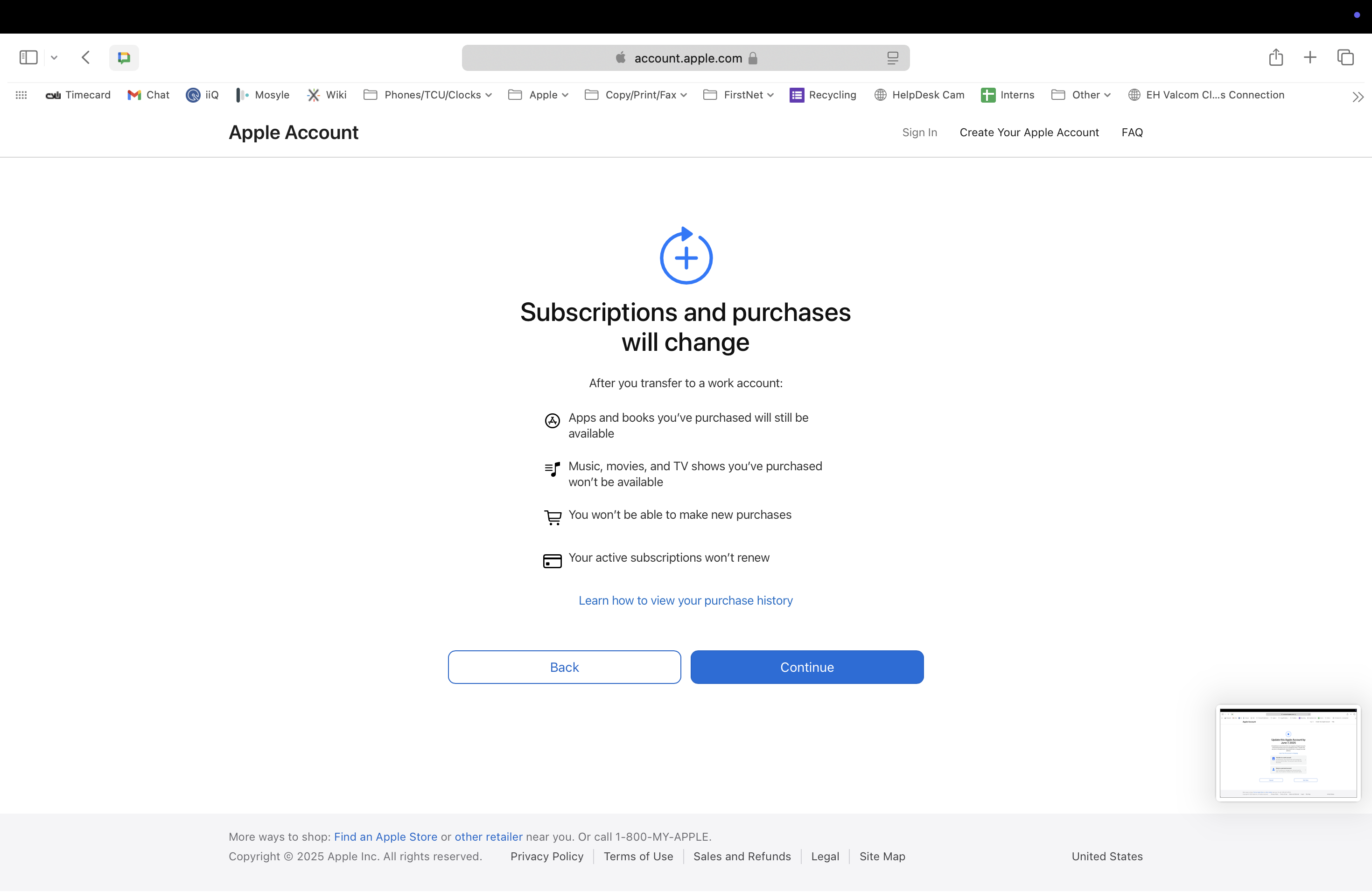 Screenshot showing the Apple prompt to transfer to a work account or keep as a personal account.
